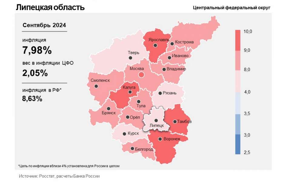 Годовая инфляция в Липецкой области уменьшилась в сентябре до 7,98% после 8,35% в августе. При этом она сложилась ниже, чем в Центральном федеральном округе (9,15%) и по России в целом (8,63%), где годовая инфляция тоже снизилась. Об этом сообщили в липецком отделении Банка России.