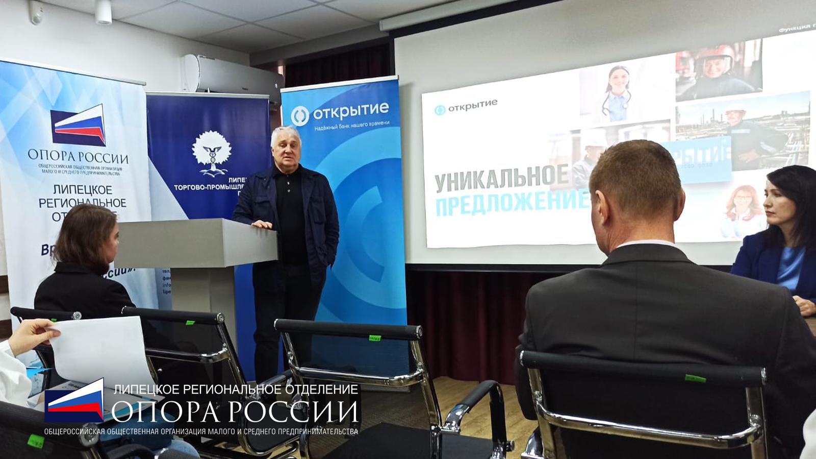 20 апреля 2023г в конференц-зале Центра «Мой бизнес» состоялся семинар «Меры поддержки МСП в рамках Нацпроекта «Малое и среднее предпринимательство», организованный Липецким региональным отделением «ОПОРА РОССИИ», Союзом «Липецкая торгово-промышленная палата» совместно с ОО «Липецкий» Филиал Центральный ПАО Банк «ФК Открытие».
