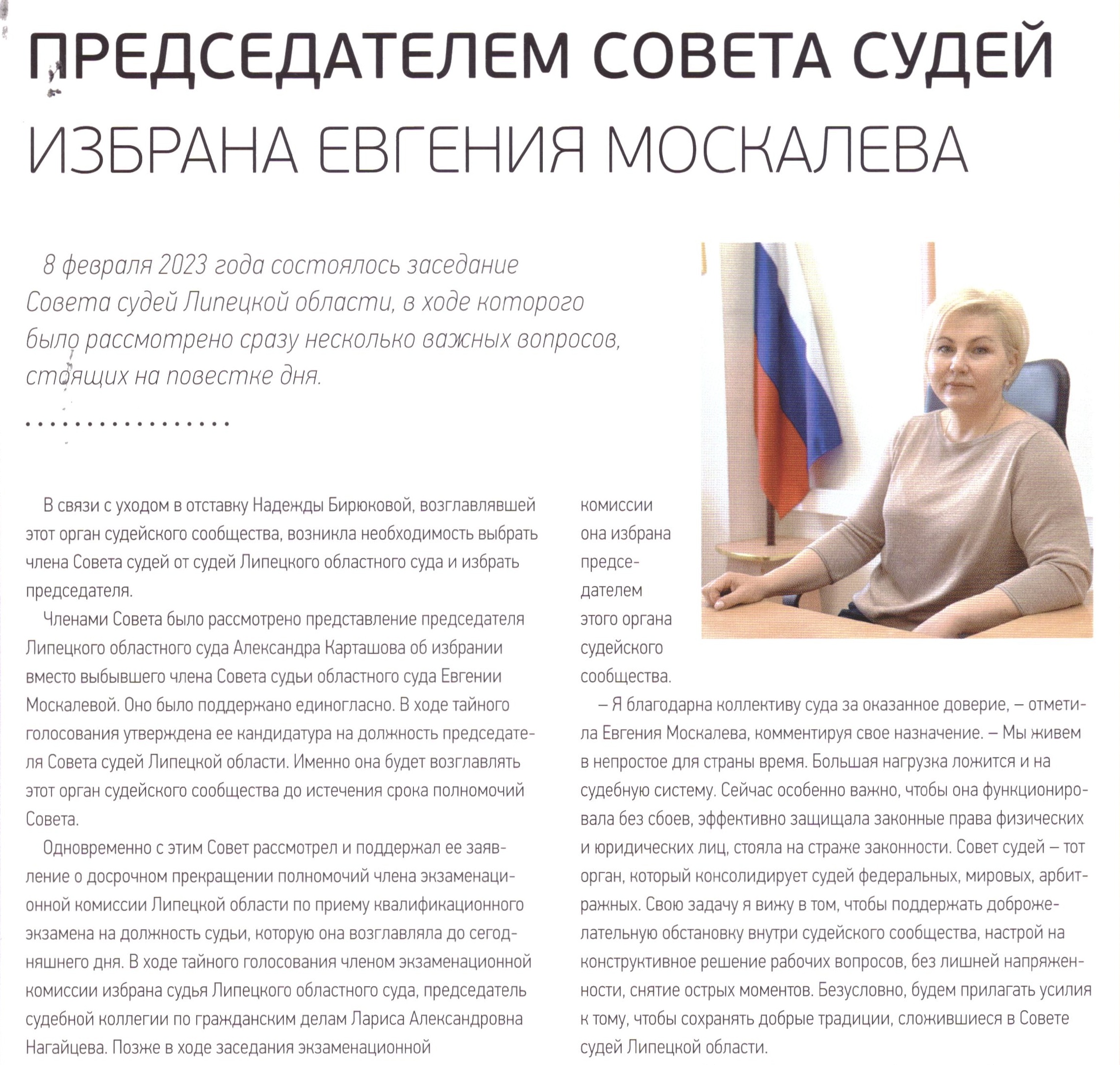 ЕВГЕНИЯ ВЛАДИМИРОВНА МОСКАЛЕВА Председатель Совета судей Липецкой области,