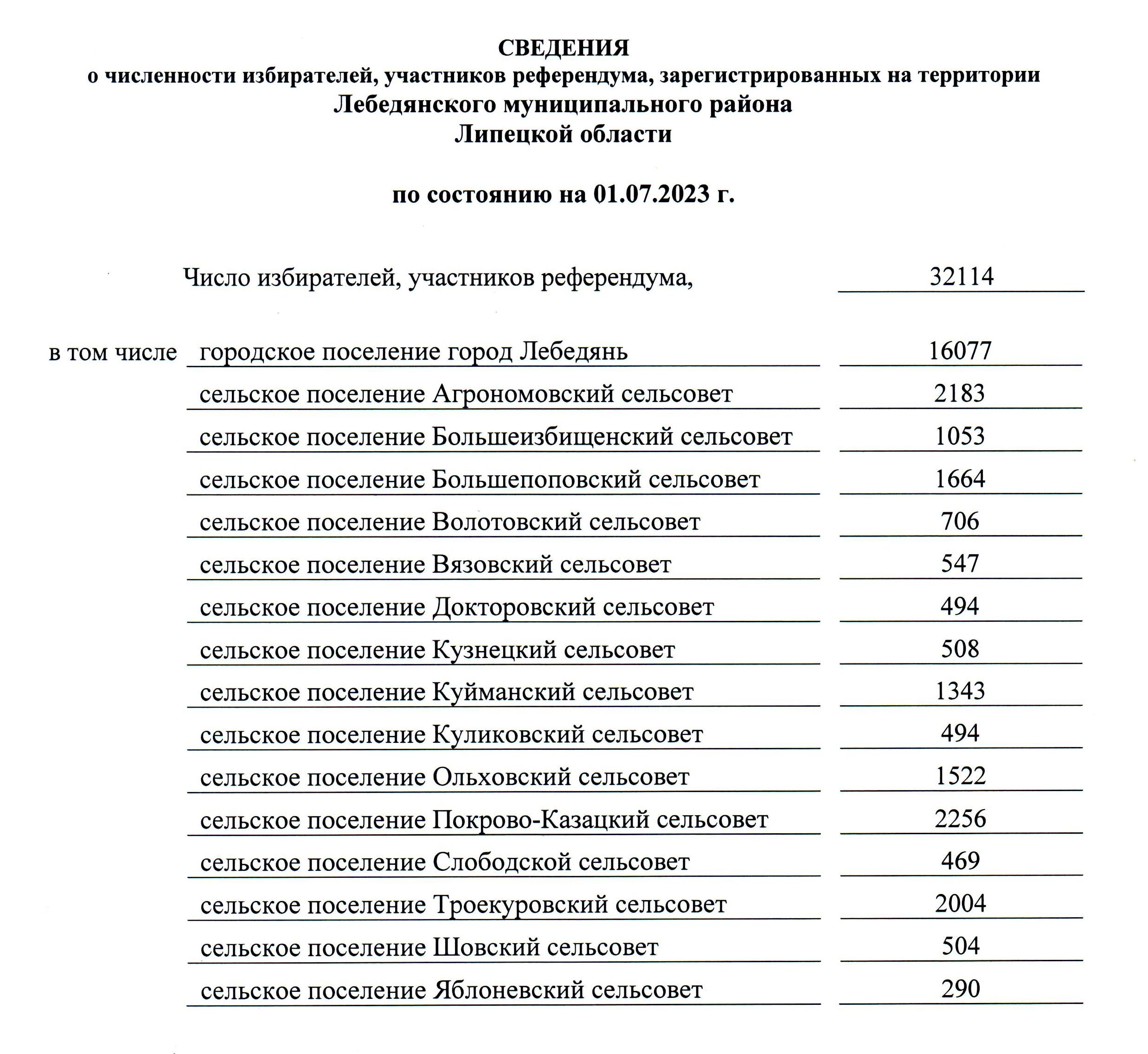 На 1 июля 2023 года в Лебедянском муниципальном районе зарегистрированы 32 тысячи 114 избирателей.