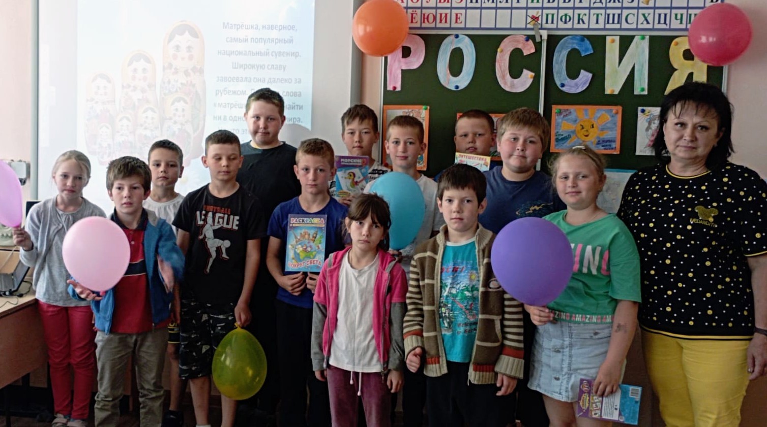 Библиотекарь рассказала детям историю праздника, о том, что Российская Федерация является многонациональным государством, на ее территории проживает более 180 национальностей, народностей и этнических групп и все они являются россиянами. О том, что Россия — это независимое государство, имеющее свою территорию, свой государственный язык, свои законы, своего всенародно выбранного Президента. Познакомила с официальными символами страны - гербом, флагом, гимном. А также школьники узнали, что у России есть еще и не официальные символы - матрешка, балалайка, береза и многое другое. Ребята с воодушевлением читали стихи о Родине, рисовали рисунки на асфальте, тем самым выражая свою детскую любовь к своей стране.