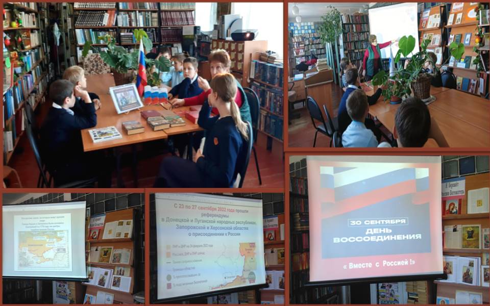 Закон "О днях воинской славы и памятных датах России» пополнился ещё одной памятной датой сентября. Ежегодно 30 сентября решено праздновать День воссоединения. 30 сентября 2022 года войдет в новейшую историю как день принятия в РФ Донецкой и Луганской народных республик, Запорожской и Херсонской областей на правах субъектов России. В основу этого судьбоносного события, когда год назад в Георгиевском зале Кремля состоялась церемония подписания договоров о принятии в состав Российской Федерации новых регионов. В договорах содержались пункты об образовании новых субъектов Российской Федерации. Это стало возможным после того, как граждане этих территорий в ходе референдумов проголосовали за вхождение в состав РФ. Специалисты Троекуровского филиала провели информационный час «Вместе с Россией». Главная цель которого рассказать детям о важности воссоединения этих территорий с Россией, близких нам по духу и крови людей.