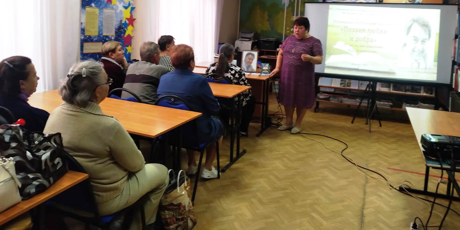 Специалист библиотеки познакомила присутствующих с богатым литературным наследием Андрея Дмитриевича, автора более 50 поэтических сборников. На его стихи написано около ста песен. Произведения поэта переведены на многие языки мира. В ходе просмотра видеопрезентации «Последний романтик ушедшего века» рассказала о жизненном и творческом пути поэта, познакомила с историей написания создания некоторых его стихотворений, познакомила с книгой мемуаров поэта «И всё-таки жизнь прекрасна» из фонда библиотеки. Участники встречи прослушали сохранившиеся уникальные записи самого мастера, песни на его стихи «Яблоки на снегу», «Лебединая верность», «Баллада о матери», «Давай попробуем вернуть» и многие другие. Завершилась встреча показом отрывков из документальных фильмов «Андрей Дементьев: его карьера и личная жизнь» и «Поэт». Читатели с удовольствием поучаствовали в музыкальном конкурсе «Угадай мелодию?». «Вся жизнь – мгновение полета!» – писал поэт, но его творчество будет жить вечно в сердцах каждого человека. Интерес к творчеству поэта не ослабевает, его стихи и песни по-прежнему популярны, потому что они подкупают своей искренностью и добротой.