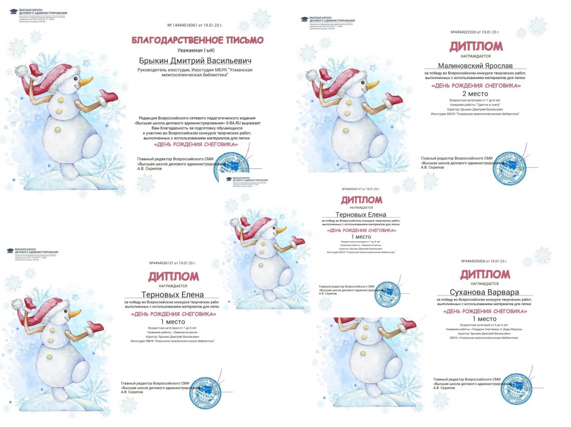Снова победы во Всероссийском конкурсе творческих работ, выполненных с использованием материалов для лепки "День рождения Снеговика". Участники Изостудии при Молодежном центре (Усманская межпоселенческая библиотека) - Терновых Елена и Суханова Варвара заняли 1 место, Косых Василиса и Малиновский Ярослав - 2 место. Руководитель Изостудии Дмитрий Брыкин получил Благодарственное письмо.