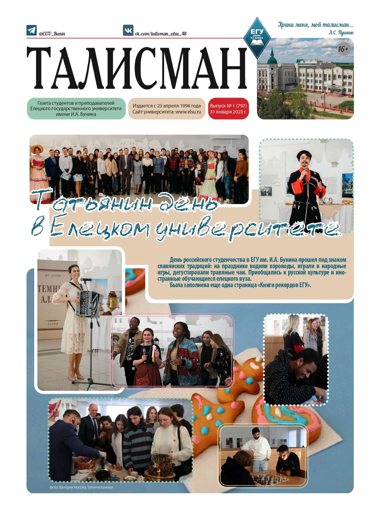 Вышел новый выпуск газеты студентов и преподавателей Елецкого государственного университета имени И.А. Бунина "Талисман".