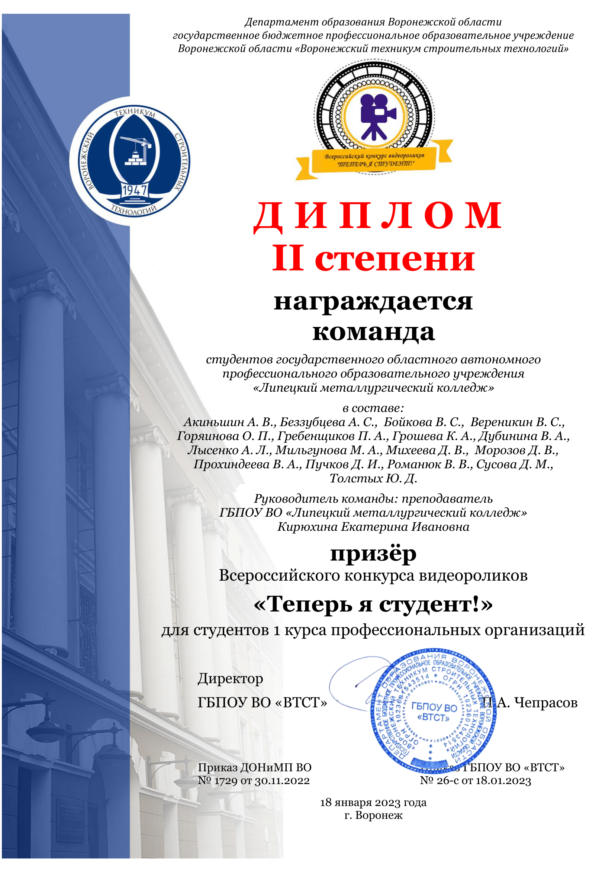 Подведены итоги Всероссийского конкурса видеороликов «Теперь я студент!». Команда Липецкого металлургического колледжа стала призером и была награждена Дипломом II степени Всероссийского конкурса видеороликов «Теперь я студент!» для студентов первого курса профессиональных организаций.