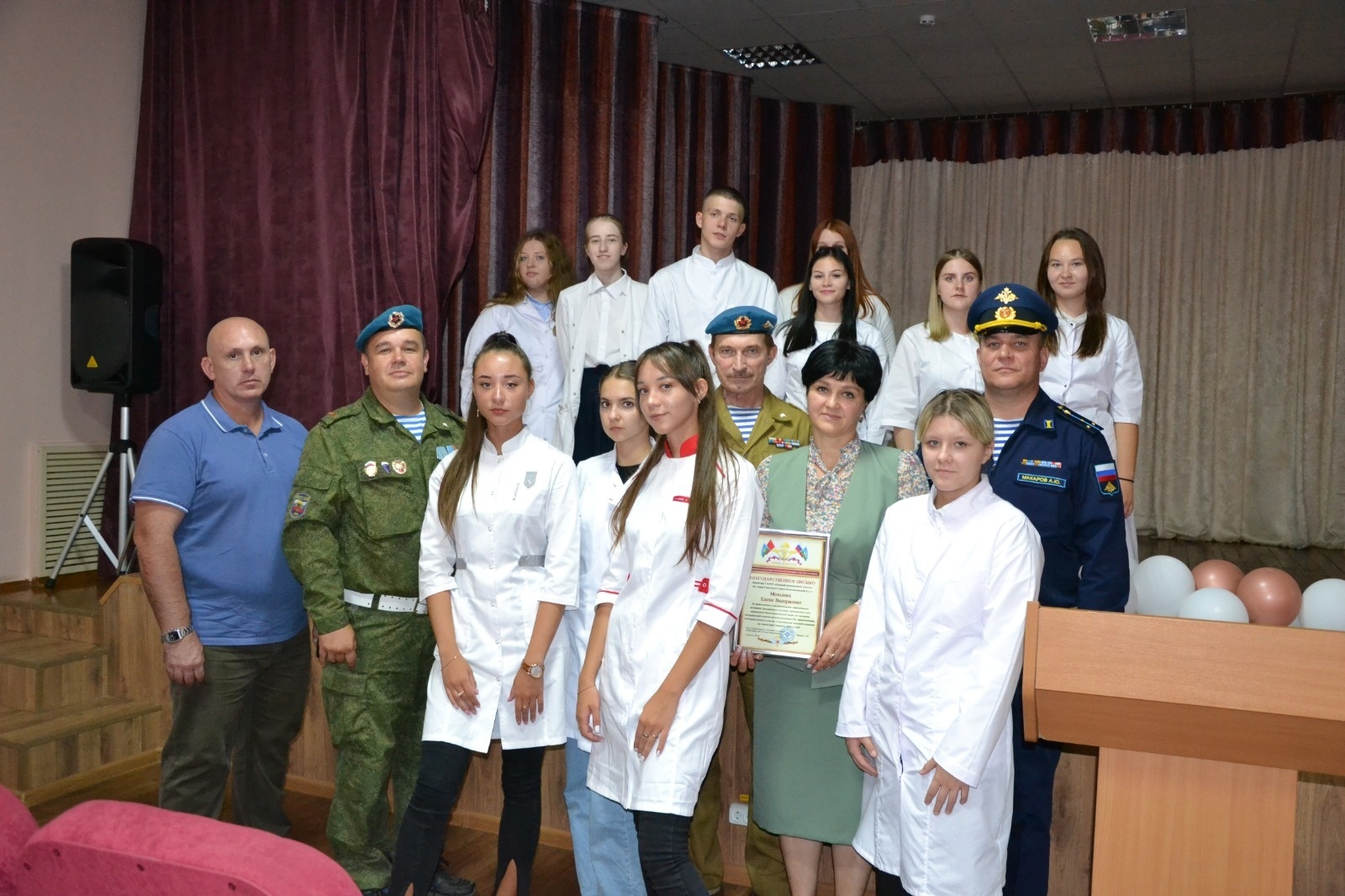 Большая патриотическая работа, организованная в стенах колледжа, и участие в оказании гуманитарной помощи были отмечены в рамках данного мероприятия Благодарностью директору Е.В. Меньших от Союза десантников.