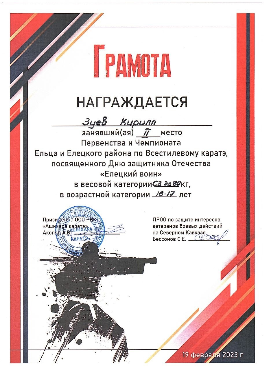 19.02 2023 студенты и преподаватели ГАПОУ ЕМК им.К.С.Константиновой приняли активное участие в Первенстве и чемпионате г. Ельца и Елецкого района по Всестилевому карате, посвящённых Дню защитника Отечества на ФОК “Воргол”