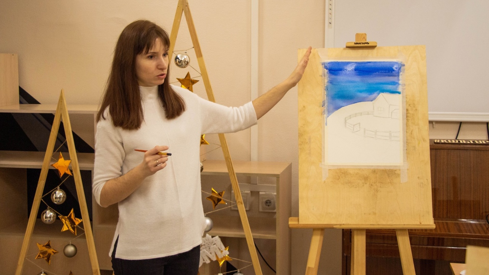 Под руководством Екатерины Бурковой участники сделали набросок карандашом, а затем приступили к работе с цветом. Картину студийцы рисовали с помощью двух акварельных техник. Небо и фон — по-мокрому, покрывая лист сначала водой, а потом краской, а остальные детали прорисовывали классическим способом — по-сухому. Сделать невероятно красивыми снег и звезды помогла белая гуашь.