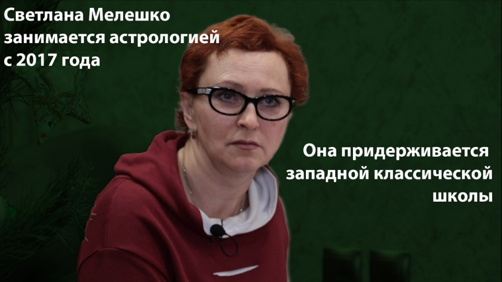 Светлана Мелешко занимается астрологией с 2017 года. Она придерживается западной классической школы. В своих прогнозах Светлана никаких сушеных лапок летучих мышей не использует. В ее арсенале только компьютер. Составлением гороскопов для регионов, городов, стран занимается мунданная астрология. С помощью астрологической программы Светлана построила натальную карту или гороскоп Липецкой области.