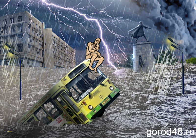 А вечером 5 июля небо над Липецком почернело. Раскаты грома и молнии сопровождали стены воды, упавшие на город. Гроза привела к нескольким кратковременным аварийным отключениям в разных районах, а вода залила несколько низин . Традиционно пострадали улица Советская у горбатого моста, Театральная площадь, перекресток улиц Фрунзе-Неделина, улица 40 лет Советской Армии. В мэрии сообщили, что с последствиями разгула стихии борются более 20 человек и 12 единиц спецтехники, но этого оказалось явно недостаточно.