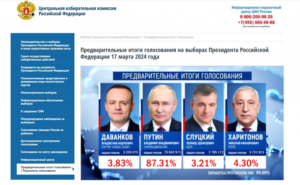 На сайте центральной избирательной комиссии РФ размещены итоги подсчета голосов на выборах президента в Липецкой области.