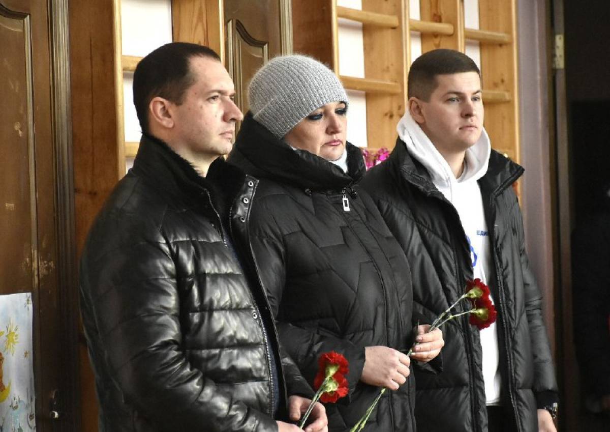 Почтили память героя в актовом зале бывшей Новочеркутинской школы, где сейчас расположен детский сад. На почетных местах – его родители, Нина Алексеевна и Николай Егорович. Рядом с ними жена Оксана, дочь София, сын Сергей, теща Ольга Михайловна. Они приехали на траурную церемонию из Костромы. Пришли на митинг односельчане, друзья, одноклассники.