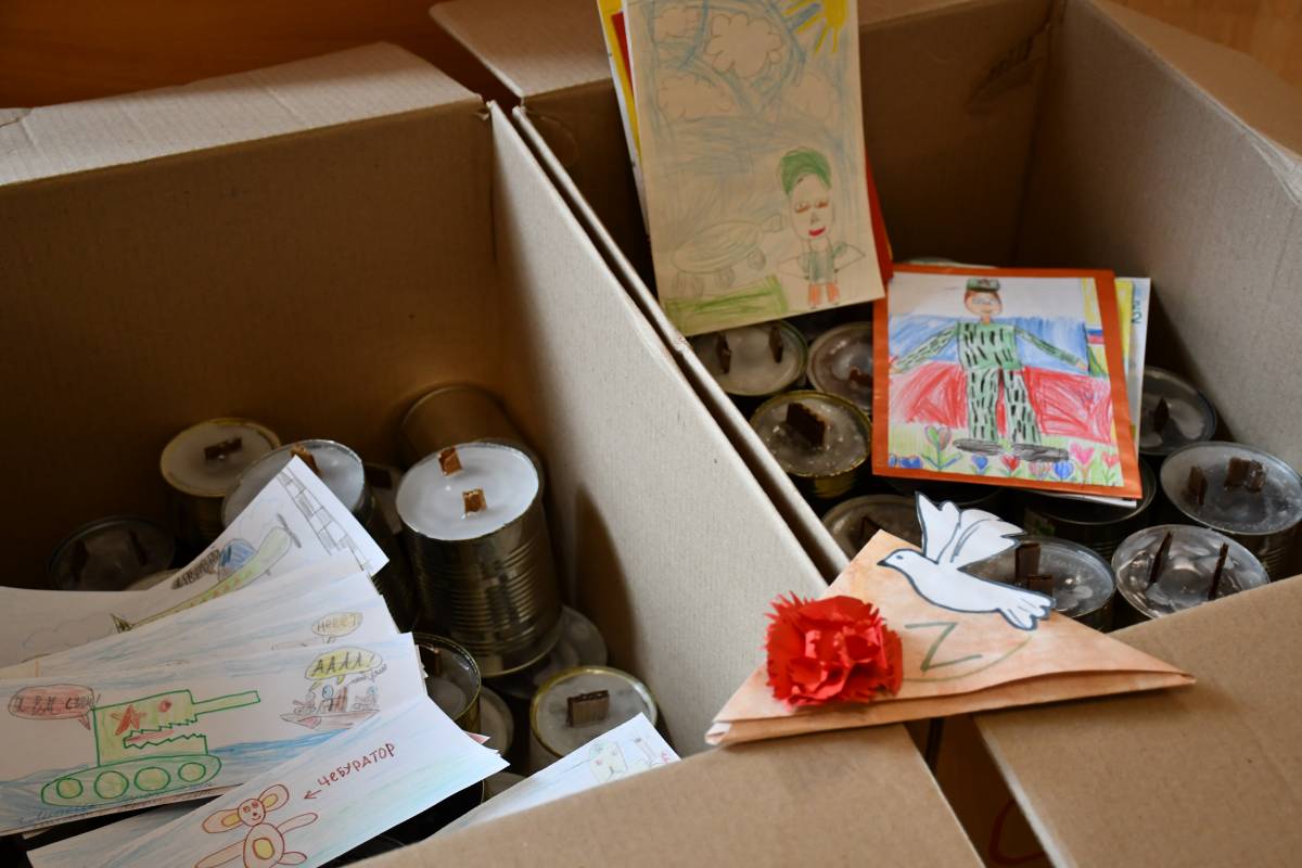 Сегодня на базу пункта приема от ребят из детского сада №68 передали письма – рисунки с пожеланиями Победы. Принесли их инициативные жители города. Они же сделали для наших солдат блиндажные свечи.