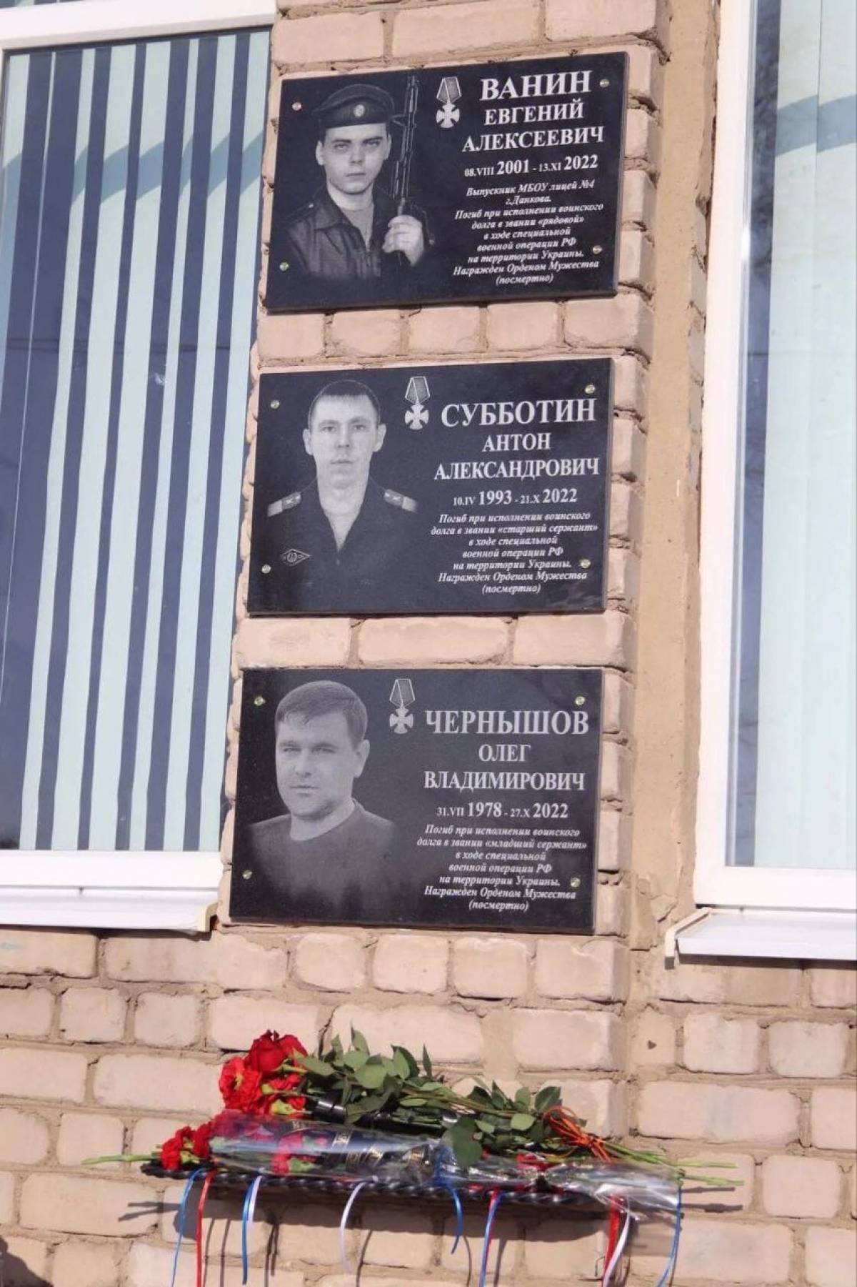 Мемориальные доски на здании фасада лицея № 4 Данковского района открыли сразу трём героям специальной военной операции – старшему сержанту Антону Субботину, младшему сержанту Олегу Чернышову,
