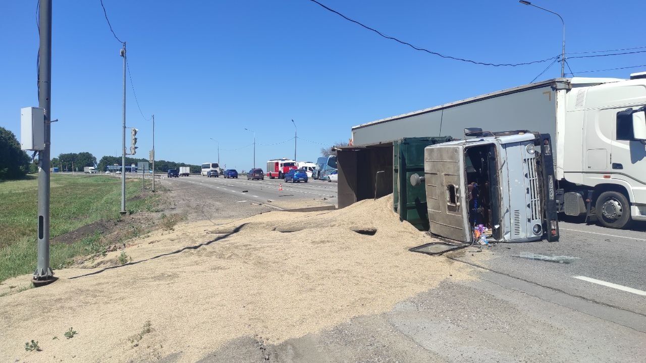 В автобусе находились 23 человека – два водителя и 21 пассажир. От столкновения зерновоз опрокинулся, травмы получили два человека – водитель автобуса и грузовика.