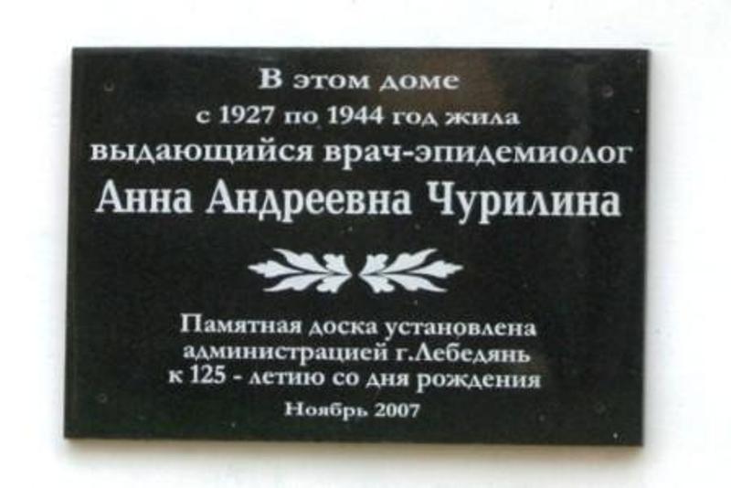 Небольшой деревянный штукатуренный дом под номером 2 на улице Свердлова знают многие лебедянцы. С 1927 по 1944 годы в нём жила выпускница Петербургского женского медицинского института Анна Андреевна Чурилина. В 1911 и 1912 годах эта отважная женщина участвовала в экспедиции русских врачей-добровольцев в Маньчжурии , где под руководством профессора Д.К. Заболотного боролась с эпидемией чумы, оказывала помощь местному населению и выявляла очаги и переносчиков этого смертельно опасного заболевания.