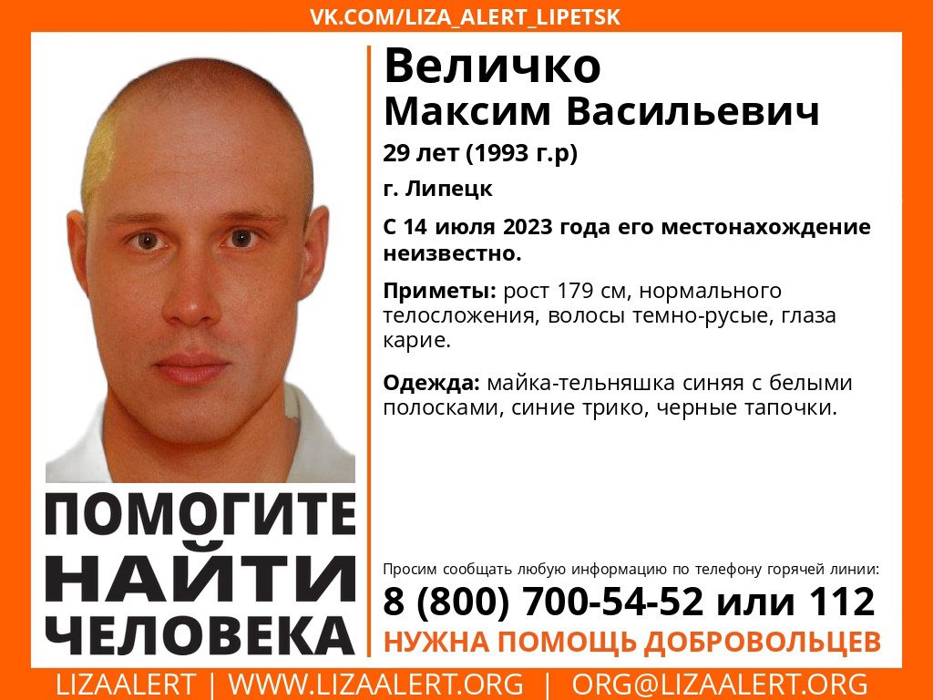 Поисково-спасательный отряд «Лиза Алерт»29-летнего парня и 67-летнюю женщину, которые пропали 14 и 15 июля, ищут в Липецкой области. Максим Величенко перестал выходить на связь с пятницы. В момент пропажи молодой человек находился предположительно находился в Липецке