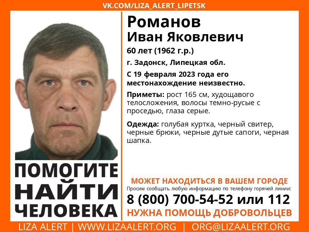 В Липецкой области ищут пропавшего 60-летнего Ивана Романова из Задонска.