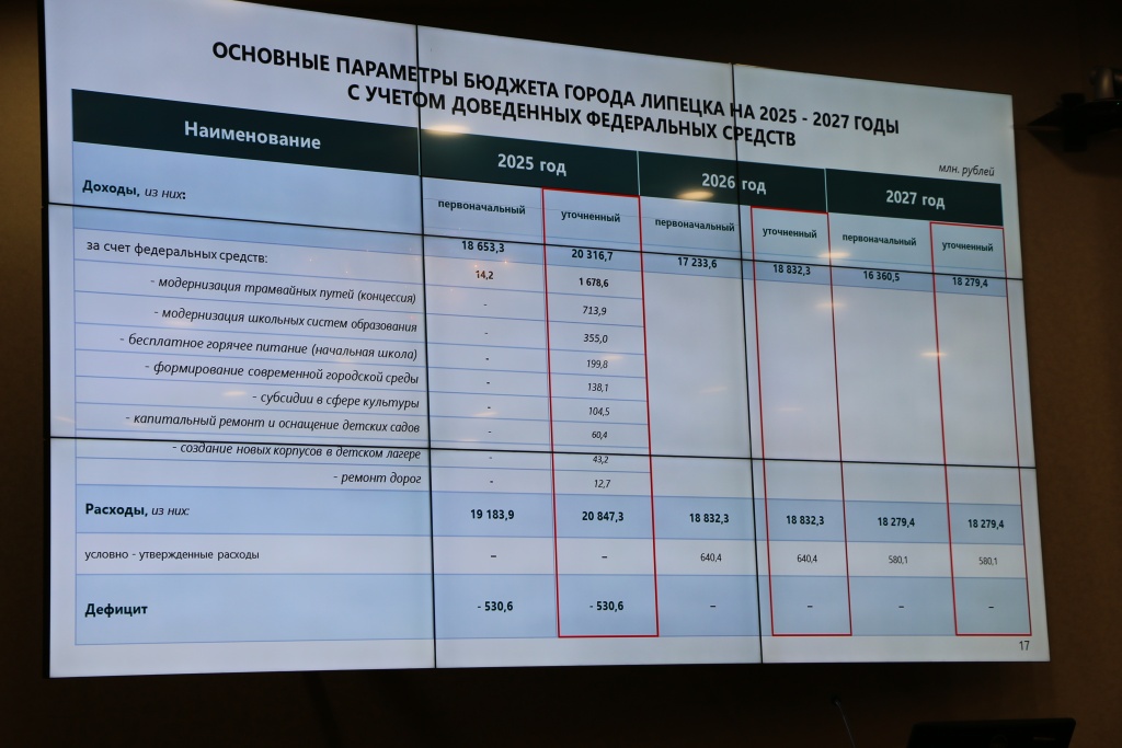 К первому чтению бюджета Липецка на 2025 год в городскую казну поступили средства из федерального бюджета. Как доложила депутатам на профильной комиссии главный финансист мэрии Татьяна Григорова, доходы бюджета выросли на 1,7 млрд рублей и составили 20,3 млрд рублей. Эти средства планируют направить на модернизацию трамвайных путей (713,9 млн); модернизацию школьных систем образования (355 млн); бесплатное горячее питание для учеников начальных классов (200 млн); формирование современной городской среды (138,1 млн); капремонт и оснащение детсадов (60,4 млн); ремонт дорог (12,7 млн) и др. По расходам городская казна прогнозируется в сумме 20,8 млрд рублей.