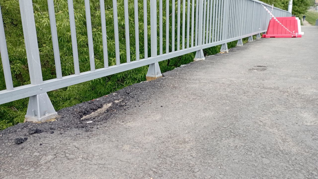 12 мая на пешеходной части моста через Каменный лог по направлению к Центральному рынку провалился асфальт . Мы побывали на мосту и обнаружили еще одну зарождающуюся дыру: в нескольких метрах от пятничной!Да и сама пешеходная часть моста не выглядит свежеотремонтированной. Во многих местах через тонкий двухсантиметровый слой асфальта уже проглядывает гидроизоляция. Покрытие тут неровное да и неплотное настолько, что носком обуви в нем запросто можно проковырять ямку.