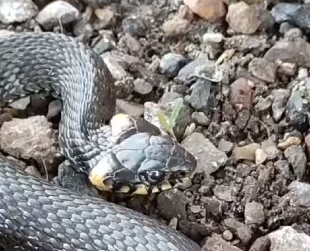 По данным источника, одну крупную змею заметили на открытой местности в Грязях. Безобидный уж грелся на солнце.