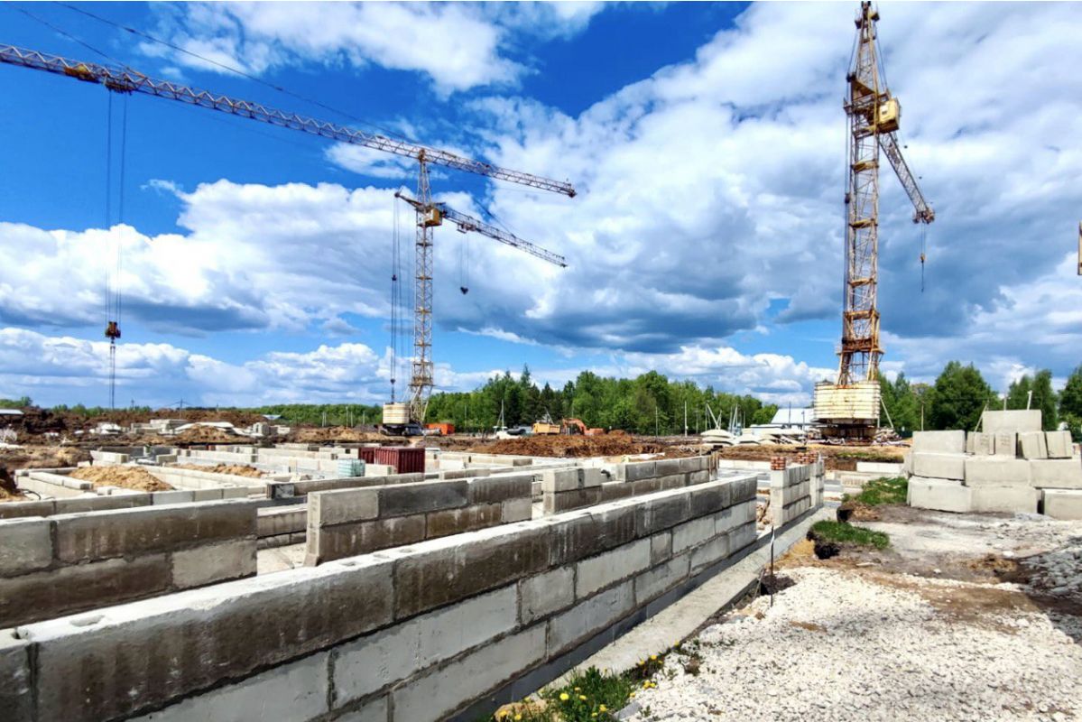 Строительство школы в Лебедяни продолжается. Рабочие закладывают фундамент под здание, затем начнут возводить колонны.