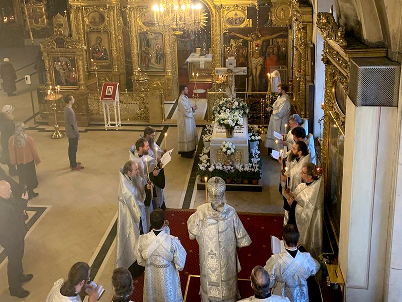 Его Высокопреосвященству сослужили протоиереи: Борис Обрембальский, клирик собора, Николай Цирке, ключарь кафедрального собора иконы Божией Матери «Знамение» г. Тюмени (вечер); столичное духовенство – иереи: Алексий Артамонов, клирик собора, Максим Хелемендик, клирик храма Благовещения Пресвятой Богородицы в Раеве, Геннадий Бочаров, клирик храма Казанской иконы Божией Матери на Красной площади, Александр Рязанцев, клирик храма иконы Божией Матери «Взыскание погибших» в Перово, Михаил Зуев, клирик храма ап. Андрея Первозванного в Метрогородке; протодиакон Валерий Щеглов, клирик храма Воскресения Христова в Сокольниках; диаконы: Алексий Катанников, клирик собора, Виталий Гасанов, клирик храма свв. Девяти мучеников Кизических (утро), Михаил Севастьянов, клирик храма свт. Николая Мирликийского в Зеленограде (вечер), Алексий Казаков, клирик храма свт. Николая Мирликийского у Соломенной сторожки (утро).