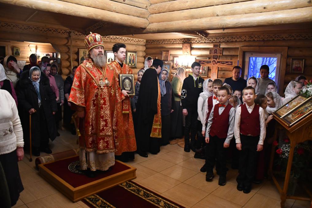 Также Его Преосвященство обратился к молящимся с проповедью и преподал всем свое архипастырское благословение, вручив небольшие иконы и шоколадки.