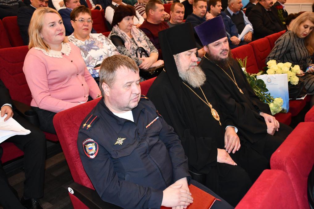 Преосвященнейший епископ Елецкий и Лебедянский Максим обратился к Дмитрию Юрьевичу со словами поздравления и преподнес ему в дар икону Святой Троицы.