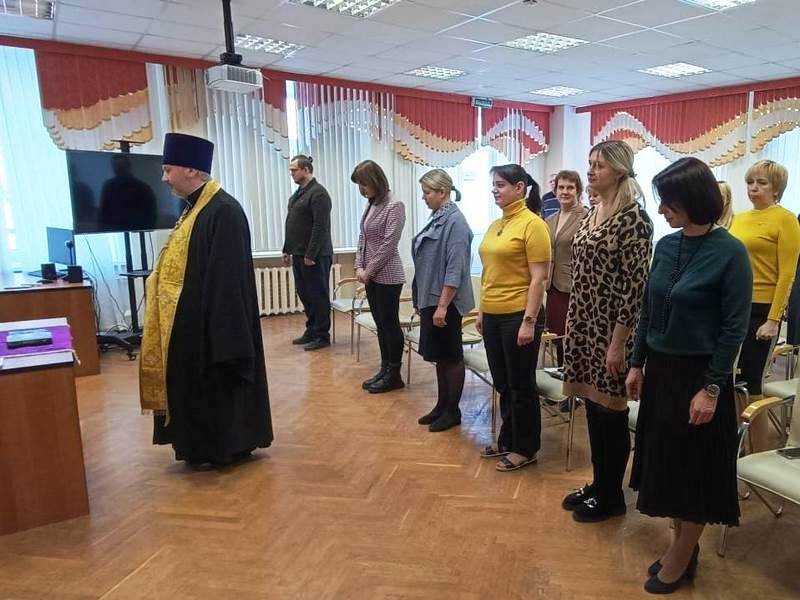 За богослужением в Областном учреждении, которое занимается развитием семейных форм устройства, социализацией детей, оставшихся без попечения родителей, и профилактикой социального сиротства, присутствовали сотрудники во главе с руководителем Драгановой Оксаной Александровной.