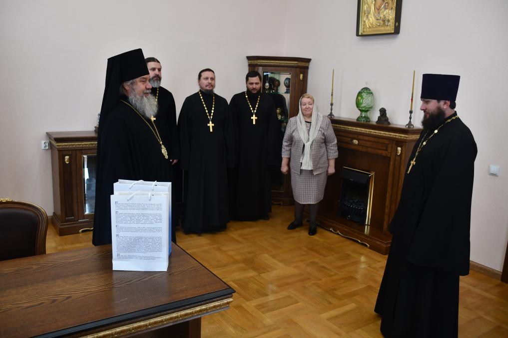 Владыка пожелал отцу Евгению Божией помощи в трудах, поблагодарил за несение послушаний и вручил памятный подарок.