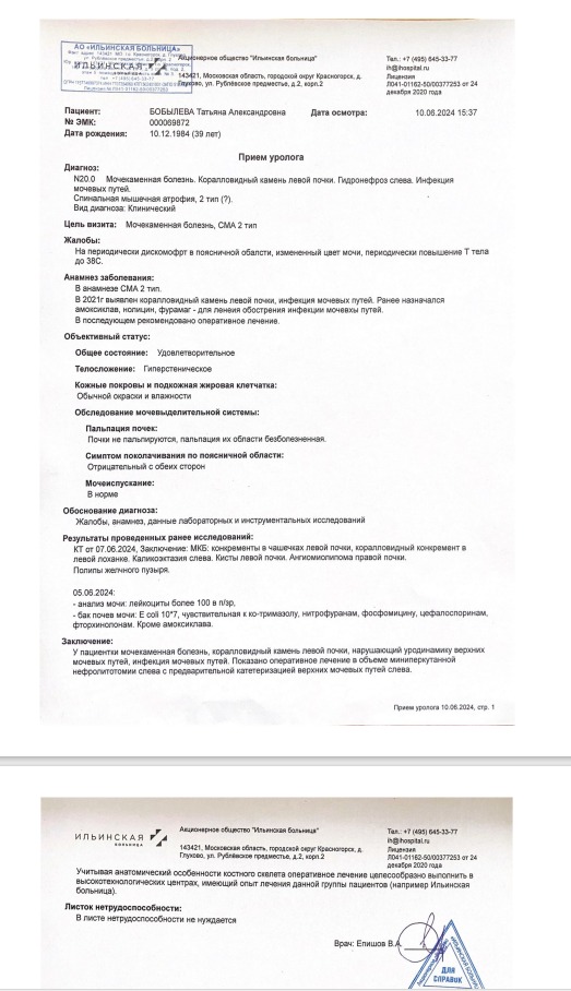 У Татьяны Бобылевой, 39-летней жительницы Липецкой области, была диагностирована мышечная атрофия, что значительно осложняет ее жизнь. Важным моментом в ее здоровье стала необходимость проведения операции по удалению камня из почки. Однако, как оказалось, такие операции для людей с подобными заболеваниями выполняют только в одном медицинском учреждении страны.