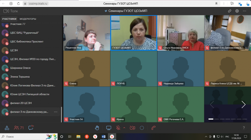 Организаторами и модераторами мероприятия выступили специалисты ГУЗОТ «Центр общественного здоровья и медицинской профилактики». В работе вебинара приняли участие сотрудники 15 организаций, на базе которых реализуется корпоративная программа: ГОАПОУ «Липецкий колледж транспорта и дорожного хозяйства», ГБУК «Липецкая областная универсальная научная библиотека», МУ «Управление главного смотрителя», ГОАПОУ «Липецкий индустриально-строительный колледж», ДК «Сокол», Центральная городская библиотека им. С.А. Есенина МУ «Централизованная библиотечная система г. Липецка», ГУЗ «Липецкий областной клинический центр», Филиал № 19 по г. Ельцу ОБУ «ЦСЗН Липецкой области», МБУК «ЦБС города Ельца», ОБУ «Областной реабилитационный центр», ГАПОУ «Елецкий медицинский колледж», ГОБПОУ «Елецкий колледж инновационных технологий», ФГБОУ ВО «Елецкий государственный университет им. Бунина», ГУЗ «Елецкая городская детская больница», МДОУ детский сад №33 г. Ельца.