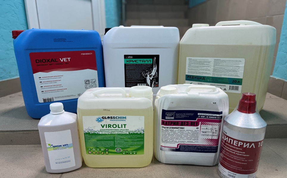 Дезинфекция: коровники - 705 т/м2, телятники – 171 т/м2, свинарники – 3 320 т/м2, птичники -3 245 т/м2, прочее – 4 150 т/м2. Всего – 11 067т/м2.