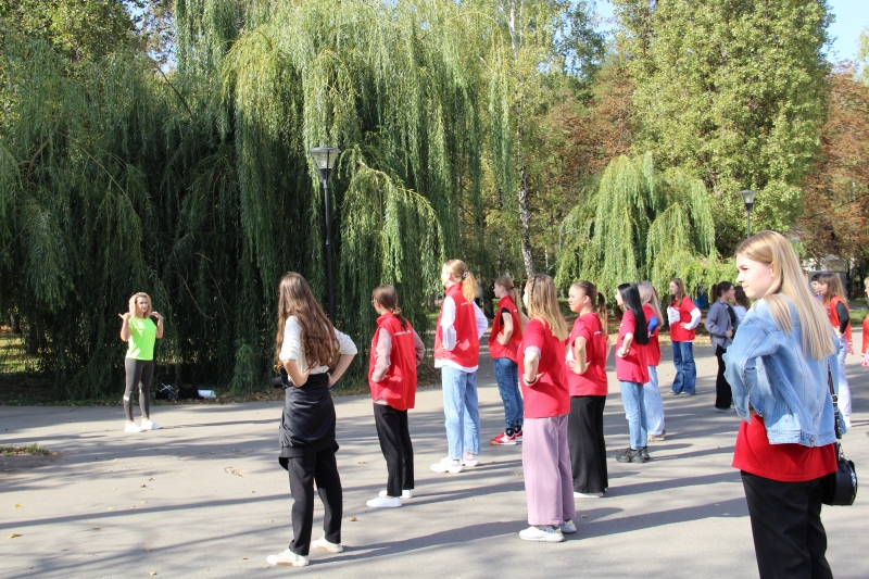 Сотрудница Областного врачебно-физкультурного диспансера Н.Б. Щербатых провела для участников акции зарядку. Студенты поддержали инициативу, проявив свою энергию и позитивное настроение. По окончании разминки участники бодро прошли 10000 шагов по территории сквера. Все студенты получили массу положительных эмоций и заряд бодрости.
