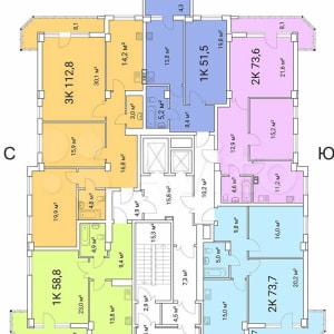 В жилом доме представлены разные планировки от 1-комнатных квартир 51 кв.м до 3-комнатных квартир 113 кв.м. Есть возможность свободной планировки внутри квартиры, за счет отсутствия несущих межкомнатных перегородок. Межквартирные и межкомнатные стены выполнены из газосиликатных блоков.